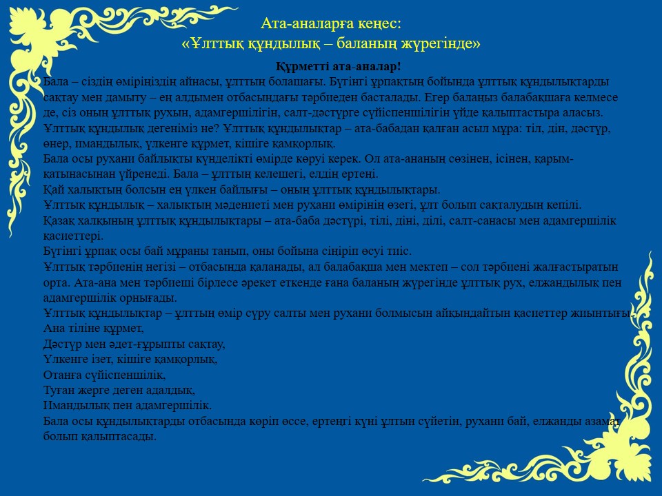 13 октябрь 2025 0 1 2 3 4 5 Ұйымдаспаған балалардың ата-аналарына кеңес: "Ұлттық құндылық-баланың жүрегінде"
